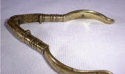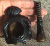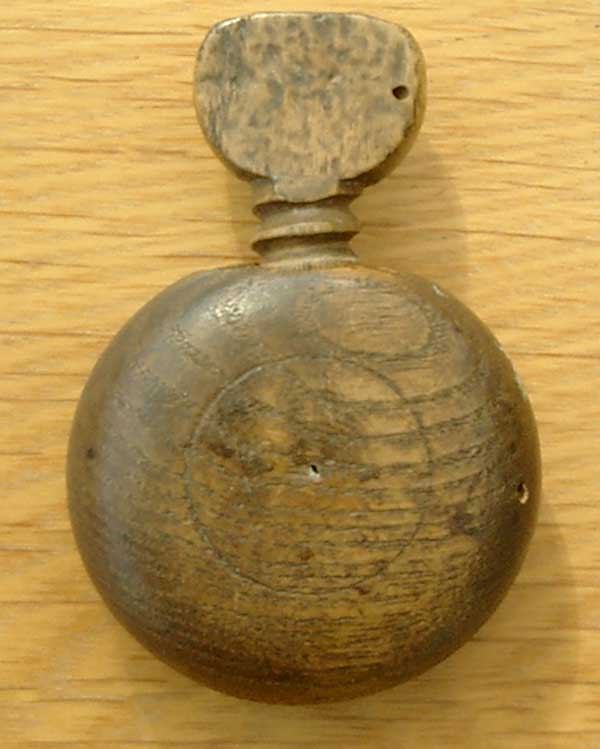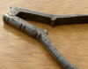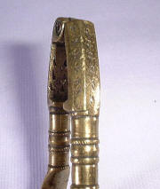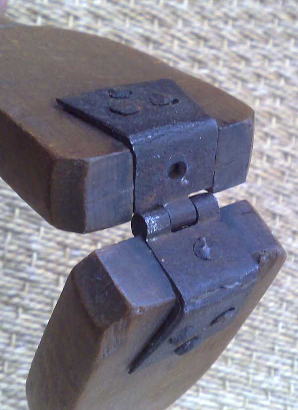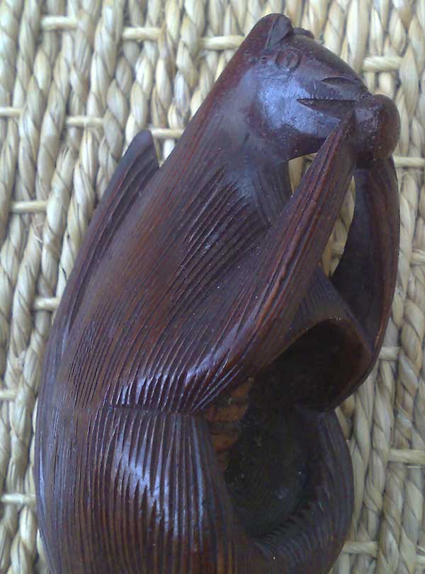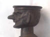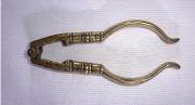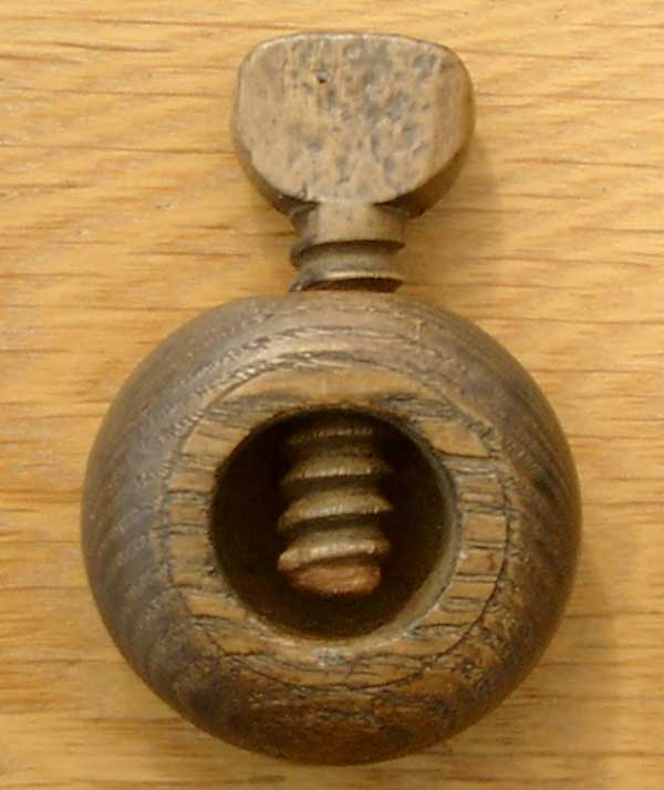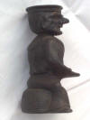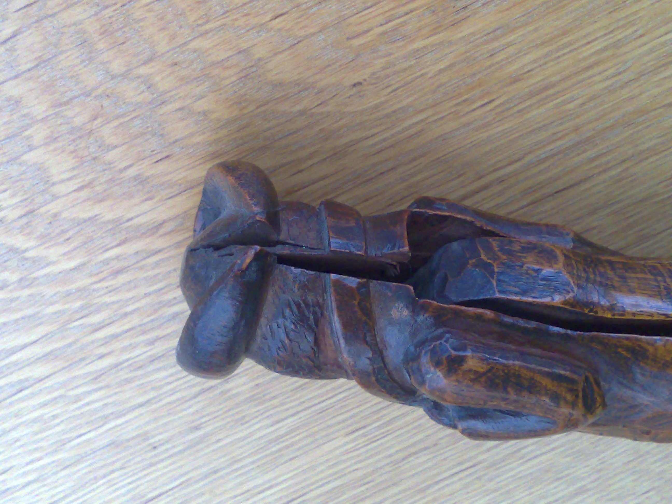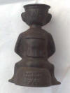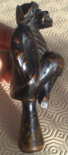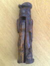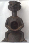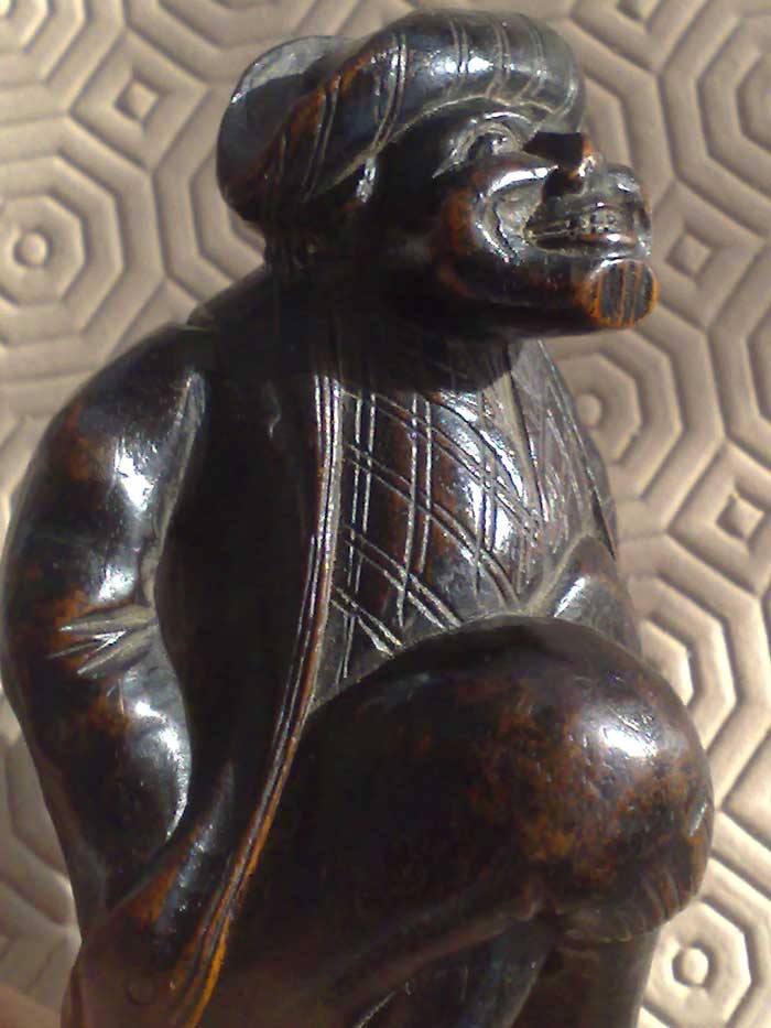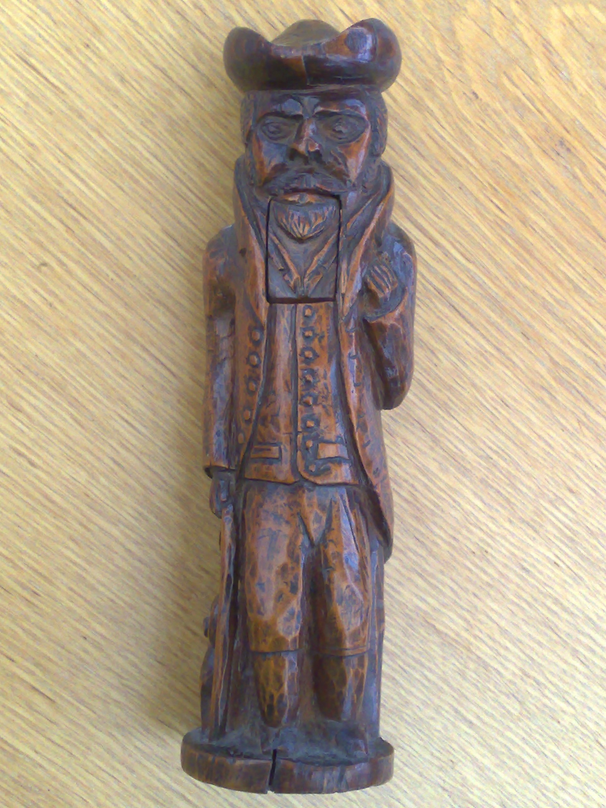 A Swiss/French or German screw cracker in the shape of a cross-legged man sitting on a pedestal. This form of nutcracker often has more ornate handles for the screw, this one is more compact and workmanlike. There is little evidence of use inside the nut cavity but the handle has good patina from handling. He has lost his feet and has several worm-type holes (see pictures) but is in good general condition for a piece of this age.