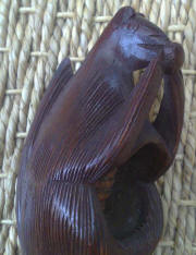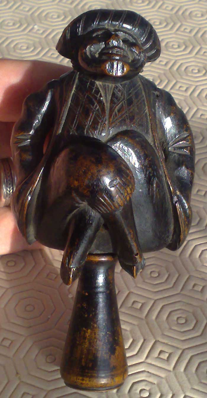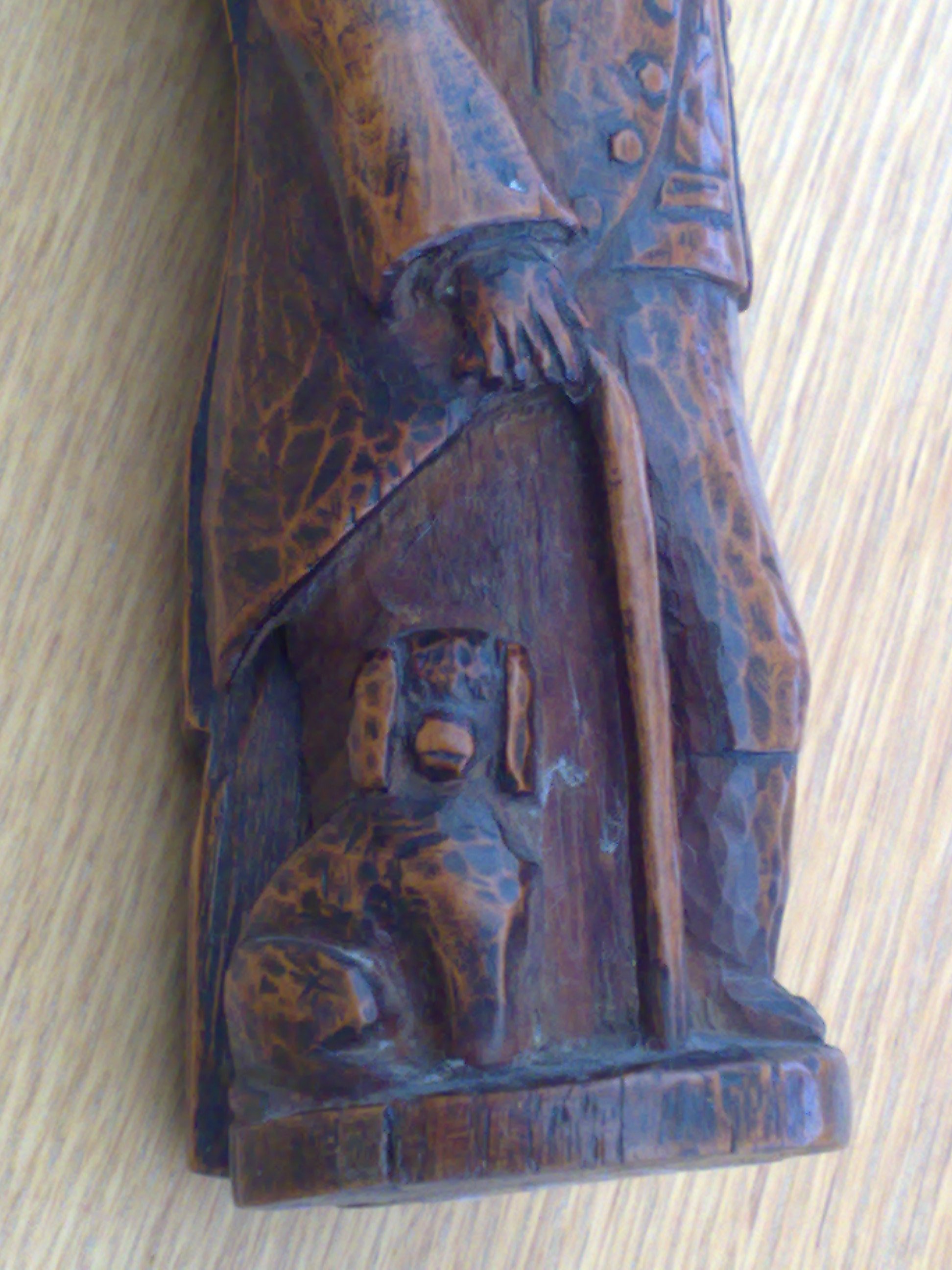 A very nice boxwood nutcracker in the form of a hatted man with stick and dog. Probably Swiss or French and a one-off - not 'tourist ware'. Great detail in his face, coat and in the dog sitting at his side. There is a small crack at the back of his head(see 5th picture) but he is structurally sound and has great colour.